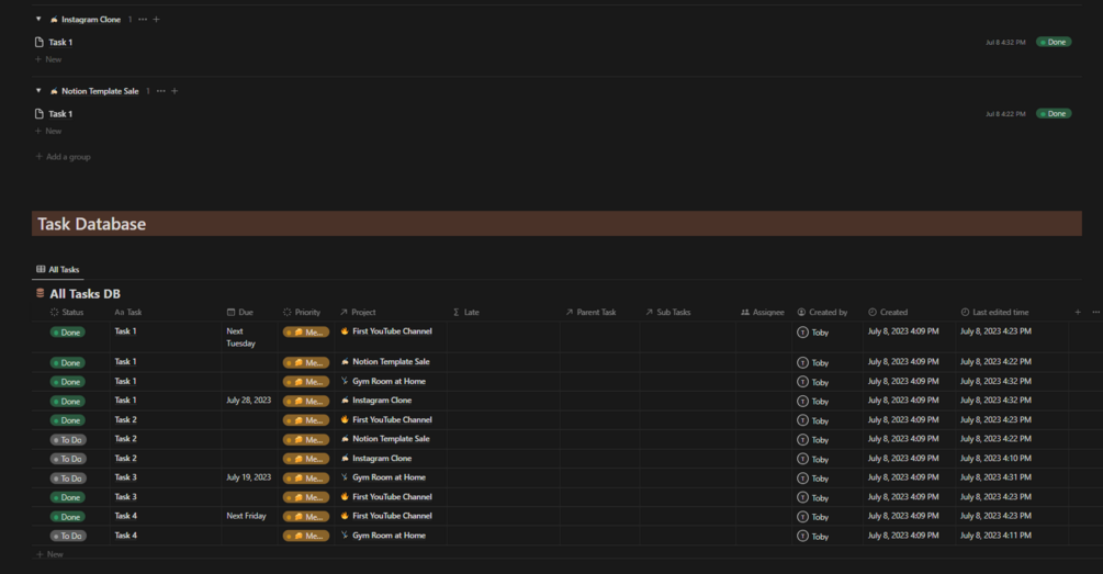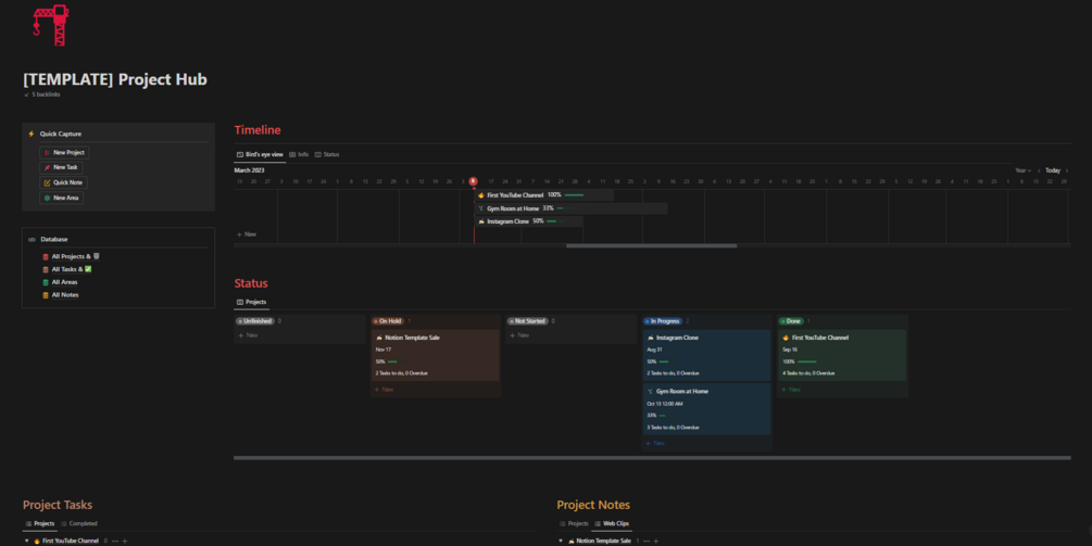 - Links to databases for all projects, tasks, areas, and notes